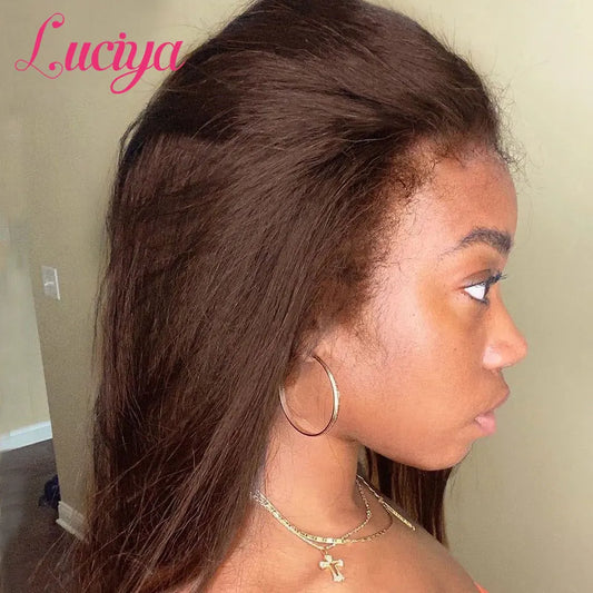 #4 Brown Colored Kinky Straight Curly Edges 13x4 Lace Front Wigs Curly Baby Hair Preplucked 360 HD Lace Frontal Human Hair Wigs